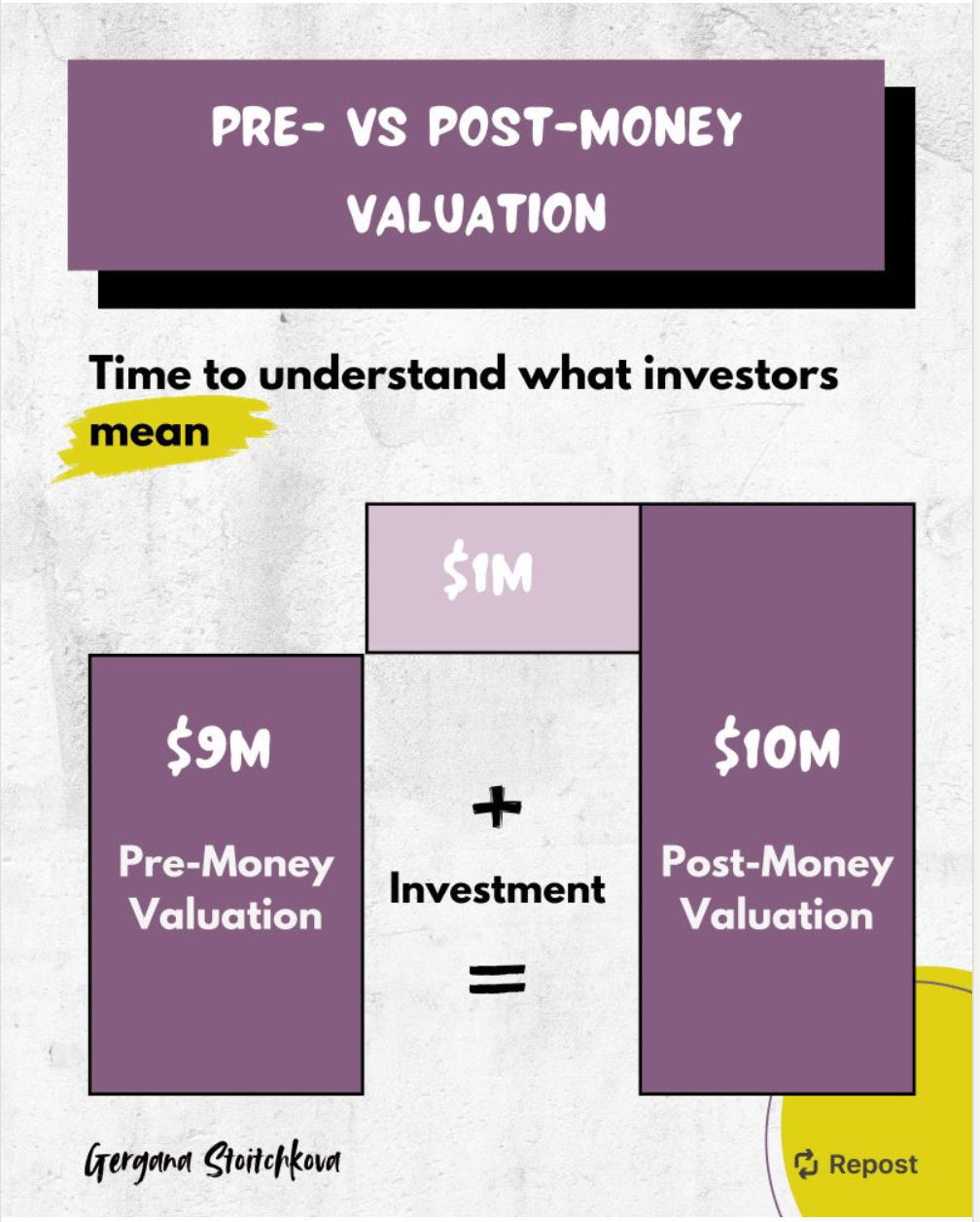 - Post-money valuation: What your company is worth after the investment